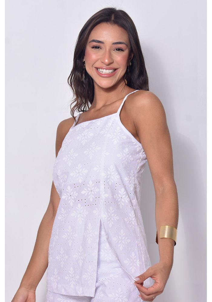 Uma blusa pra usar bastante, fresquinha e fácil de combinar no dia a dia. Ela é em laise, tem caimento soltinho, alcinhas finas e bordado delicado que deixa o visual leve. A fenda lateral traz movimento e deixa a peça ainda mais confortável de usar, perfeita pra te acompanhar em produções simples e bonitas.