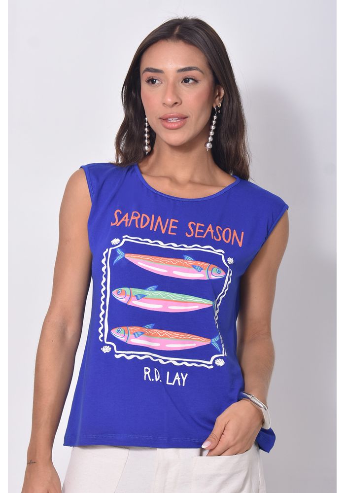 Com toque macio e caimento leve, a blusa ganha destaque pela estampa exclusiva Sardine Season, cheia de cores e traços que deixam o visual mais divertido. O formato regata traz frescor e um caimento confortável, perfeito para compor looks casuais com um toque de personalidade.