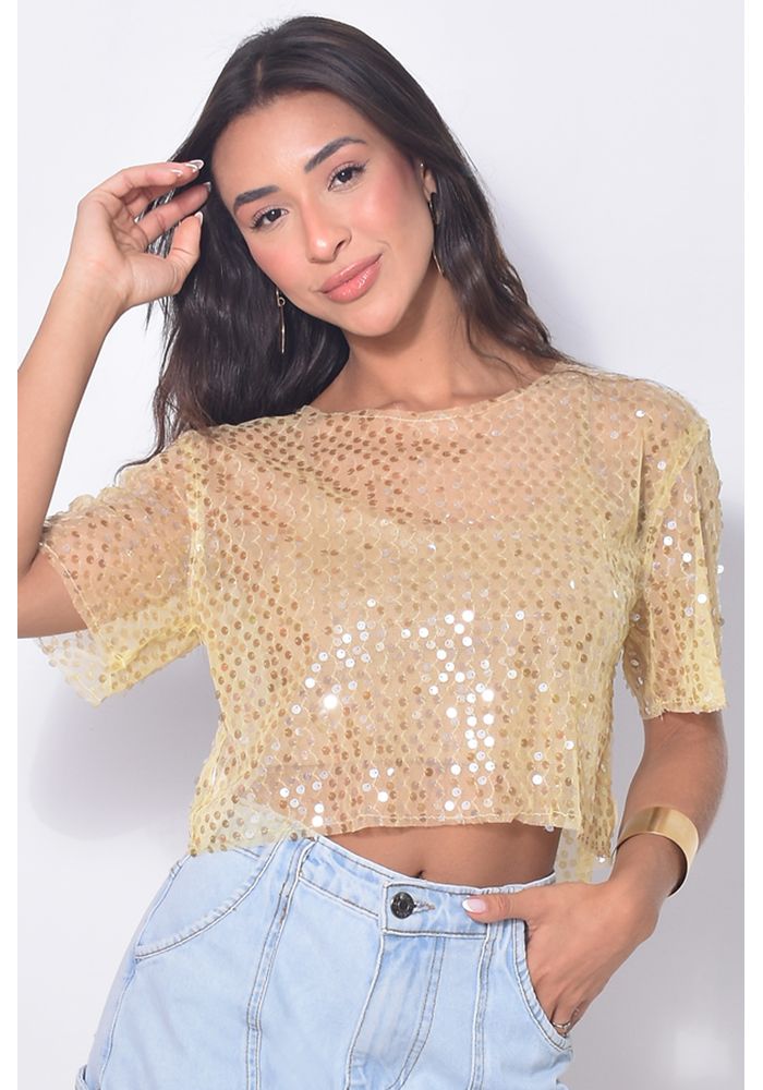 A blusa combina leve transparência com o brilho delicado dos paetês dourados, criando um visual festivo com toque moderno. Sua modelagem soltinha traz movimento e conforto, enquanto o comprimento cropped deixa o look despojado e cheio de estilo. Ideal para iluminar produções noturnas com frescor e leveza.
