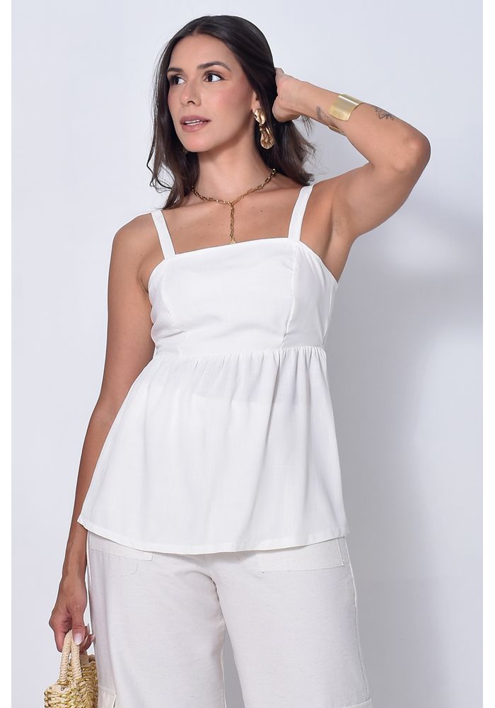 Leve, fresquinha e com aquele charme que transforma qualquer look, essa blusa é daquelas que a gente coloca e já se sente arrumada. O caimento suave deixa o visual delicado, enquanto o decote reto mantém tudo moderno e fácil de usar. Nas costas, a amarração ajustável é o detalhe que faz toda a diferença, trazendo personalidade e permitindo regular do jeito que você prefere. Versátil e super prática, combina com tudo e funciona em qualquer ocasião do dia.
