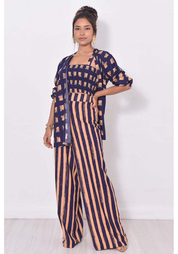 Nossa calça pantalona de viscose estampada é perfeita para quem busca conforto e elegância no dia a dia. Com uma estampa listrada moderna em tons de bege e azul-marinho, ela combina sofisticação e frescor em uma peça versátil e atemporal.