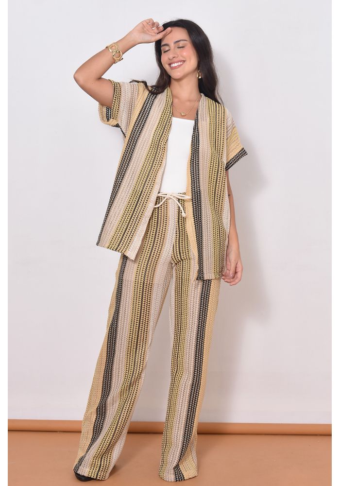 O kimono em tricô é a peça que une estilo e conforto. Com listras em tons neutros e toque artesanal, ele traz leveza e sofisticação para qualquer look. Versátil, pode ser usado aberto sobre blusas básicas ou combinado ao conjunto coordenado para um visual ainda mais elegante. O caimento fluido e as mangas curtas garantem frescor, tornando-o ideal para composições modernas em qualquer ocasião.