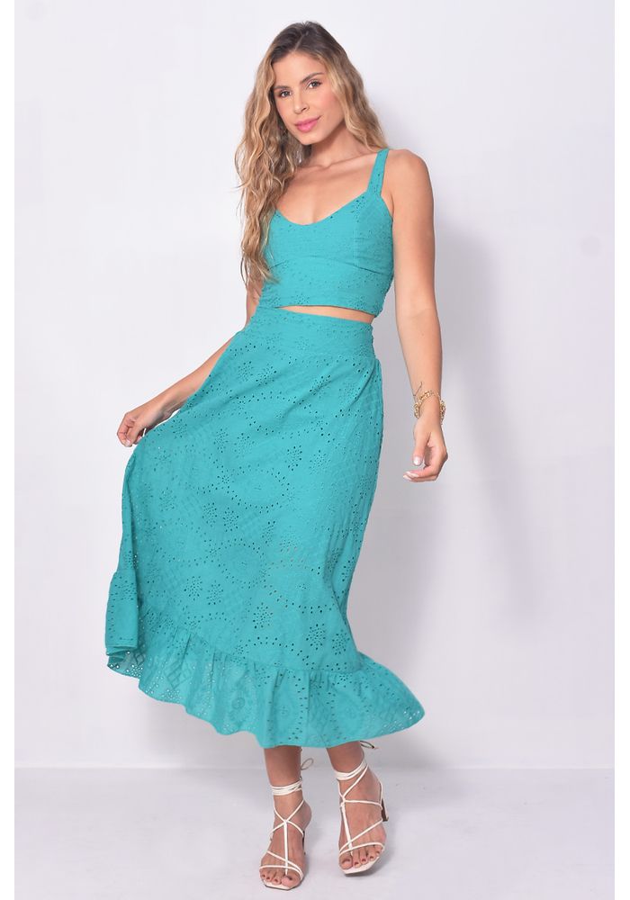O conjunto em laise com cropped e saia midi é a escolha certa para quem busca um visual leve, feminino e atual. O cropped tem modelagem ajustada, alças largas e decote que valoriza o colo com conforto, enquanto a saia de cintura alta e caimento fluido garante movimento e charme, finalizada com babado na barra que traz um toque delicado ao look. O tecido em laise, com desenhos vazados, traz frescor e um ar romântico que nunca sai de moda.