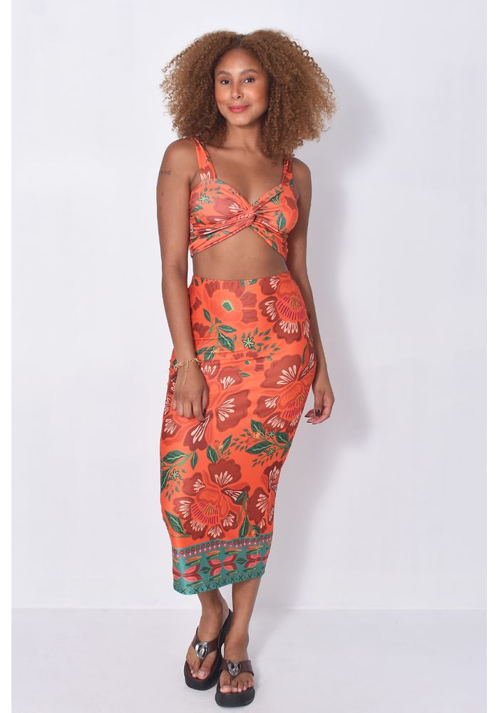 O conjunto combina frescor, cor e estilo em duas peças que se complementam perfeitamente. O top cropped traz um recorte moderno com torção frontal e alças confortáveis, valorizando o busto e criando um visual leve e cheio de charme. Já a saia midi acompanha o mesmo estilo vibrante, com caimento soltinho, estampa floral com as cores do verão e barra contrastante que dá ainda mais personalidade ao look.