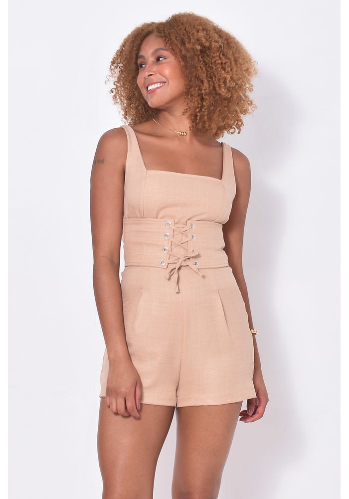O macaquinho de alfaiataria com detalhe corset combina estilo e conforto em uma modelagem que valoriza a silhueta com elegância. Possui decote quadrado e alças largas que equilibram o visual, enquanto o recorte na cintura com amarração frontal tipo espartilho realça a feminilidade e garante um ajuste perfeito ao corpo. A parte inferior apresenta caimento levemente solto, trazendo leveza e movimento à peça.