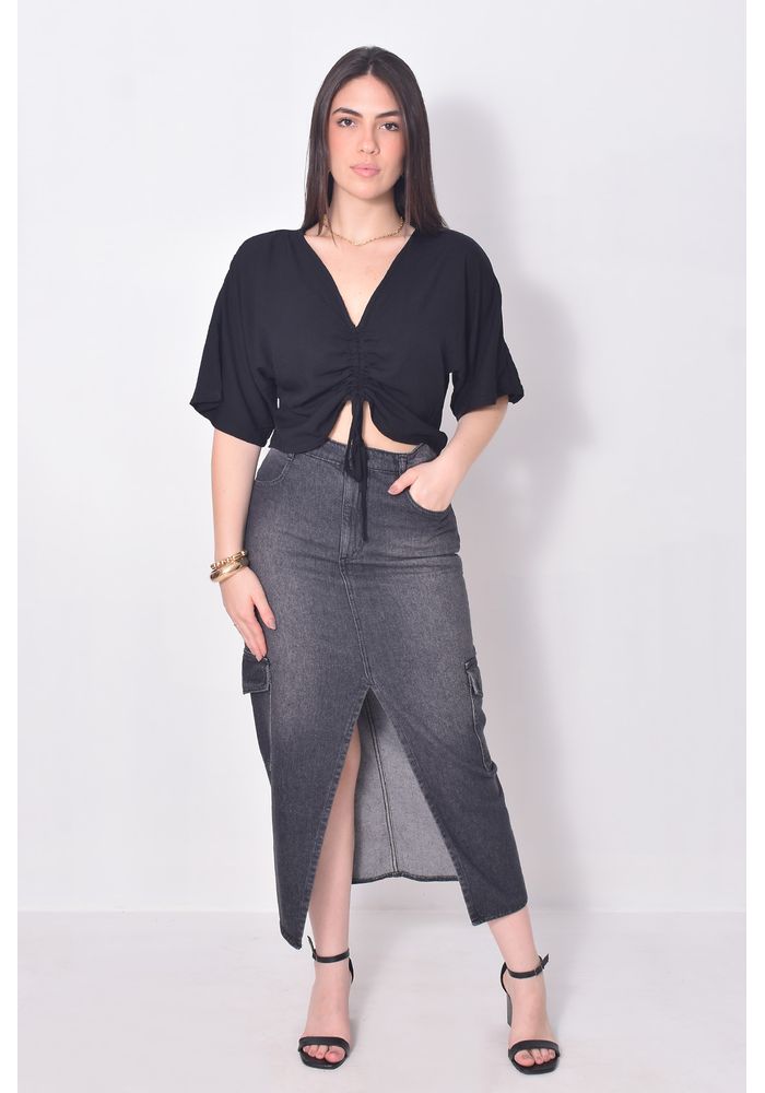 A saia jeans midi cargo apresenta modelagem reta e comprimento midi, valorizando a silhueta com elegância. O grande diferencial está nos bolsos cargo laterais, que trazem a tendência utilitária de forma descolada ao visual. A fenda frontal adiciona movimento e um toque de sensualidade, equilibrando perfeitamente com o caimento estruturado do jeans. Confeccionada em jeans 100% algodão, a saia apresenta lavagem escura com leve efeito estonado, que ajuda a alongar a silhueta e destaca os recortes da peça. Esse acabamento confere um visual moderno, ideal para compor desde produções casuais até looks urbanos com mais atitude. Com cós com passantes, bolsos traseiros funcionais e barra desfiada, a peça é versátil, atemporal e perfeita para quem busca uma saia jeans midi com personalidade e caimento impecável.