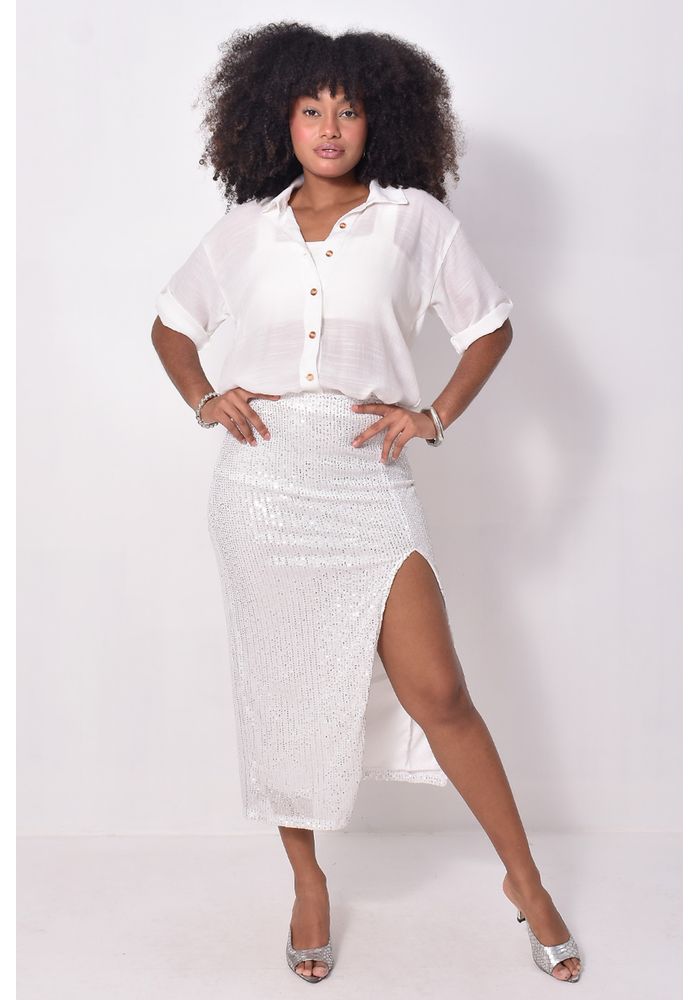 A saia tem um visual elegante, com comprimento midi e um caimento que acompanha o corpo de um jeito leve. O brilho dos paetês surge de forma discreta, criando um efeito iluminado que deixa a peça mais interessante sem exagero. A fenda lateral quebra a seriedade e traz movimento, dando um toque de ousadia na medida. É daquelas peças que funcionam tanto em produções mais cuidadas quanto em combinações básicas, quando a ideia é só adicionar um detalhe especial ao look.