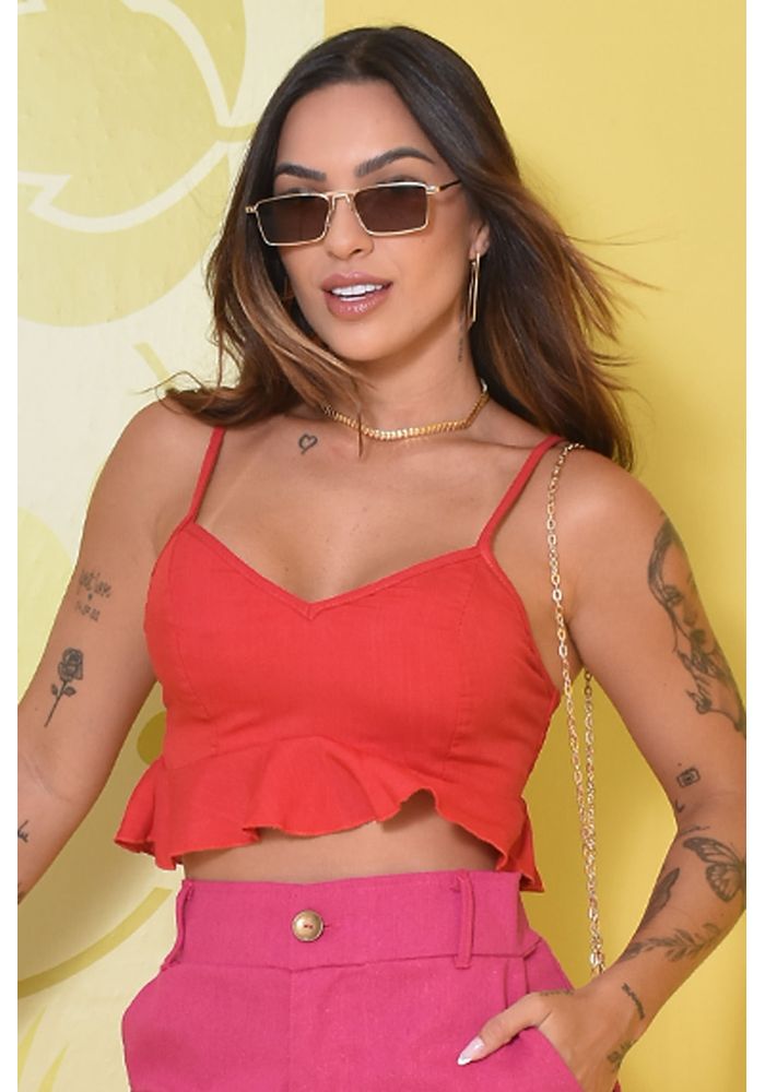 Top de viscolinho com decote e babados. As alças finas e o decote em V destacam o colo de forma delicada, enquanto o peplum babado adiciona um toque romântico, proporcionando um caimento fluido e despojado. O detalhe de lastex nas costas garante um ajuste confortável, se adaptando de maneira suave às curvas do corpo.