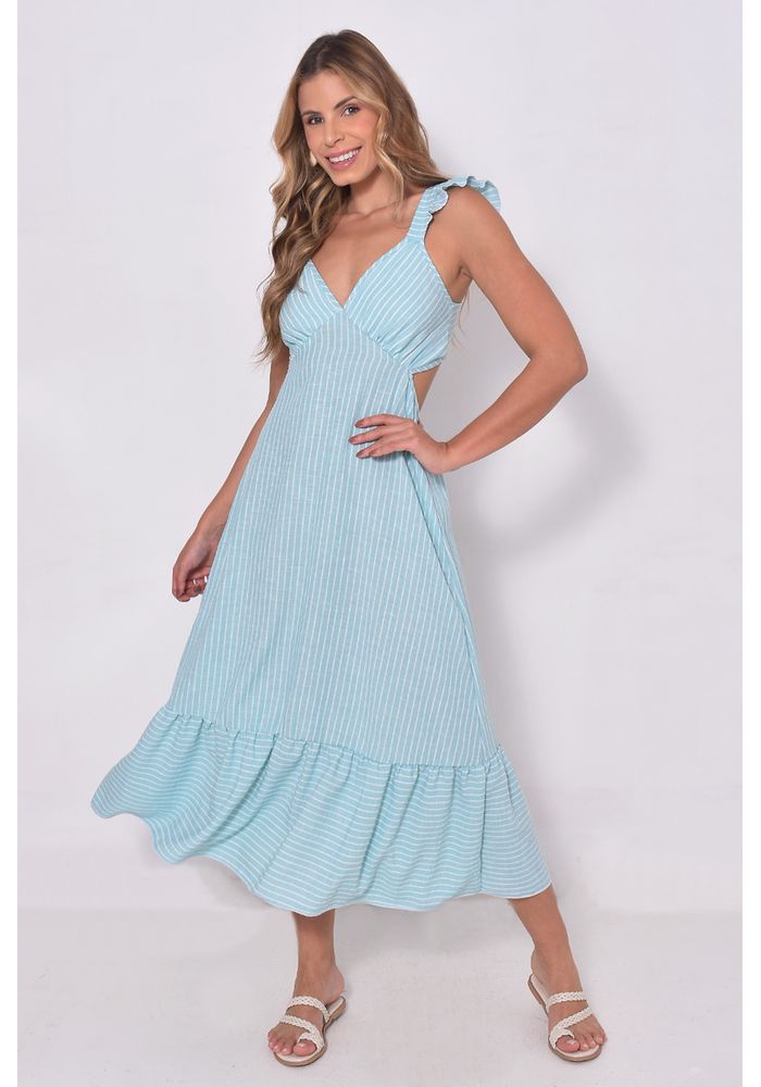 O Vestido Listrado Midi com Babado é aquele modelo que une leveza e charme na medida certa. Possui decote em “V”, alças com babadinhos e recorte nas costas com amarração ajustável, que valoriza a silhueta e garante um caimento perfeito. A saia ampla com babado na barra traz movimento e um toque delicado ao visual, ideal para um look fresco e feminino.