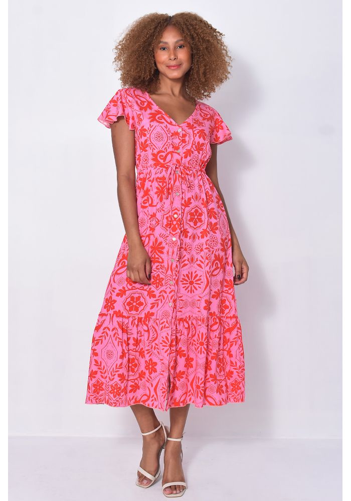 Com modelagem midi e caimento soltinho, o vestido garante movimento e conforto, enquanto o decote em V com botões e o detalhe ajustável na cintura valorizam a silhueta de um jeito natural e charmoso. As mangas curtas e a estampa vibrante dão aquele ar descontraído e cheio de vida. Um vestido versátil, estiloso e fácil de usar.